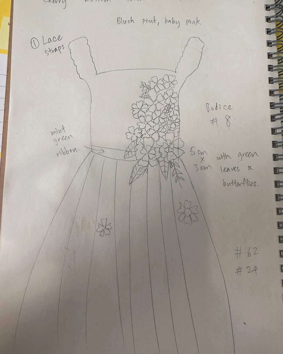 Thus, the idea for my shop, Booja Booja Bee, was born in 2021 on Etsy. The name was inspired by my daughter's own baby language. Despite having no prior experience in design, I took the first step by sketchingmy ideas in a notebook, carefully sourcing fine materials, crafting the dresses with the help of my partner, Yun, and blending our ideas and thoughts into the dresses. Each dress we create is a reflection of our shared vision, love, and care — each design feeling like a baby born into the world.
